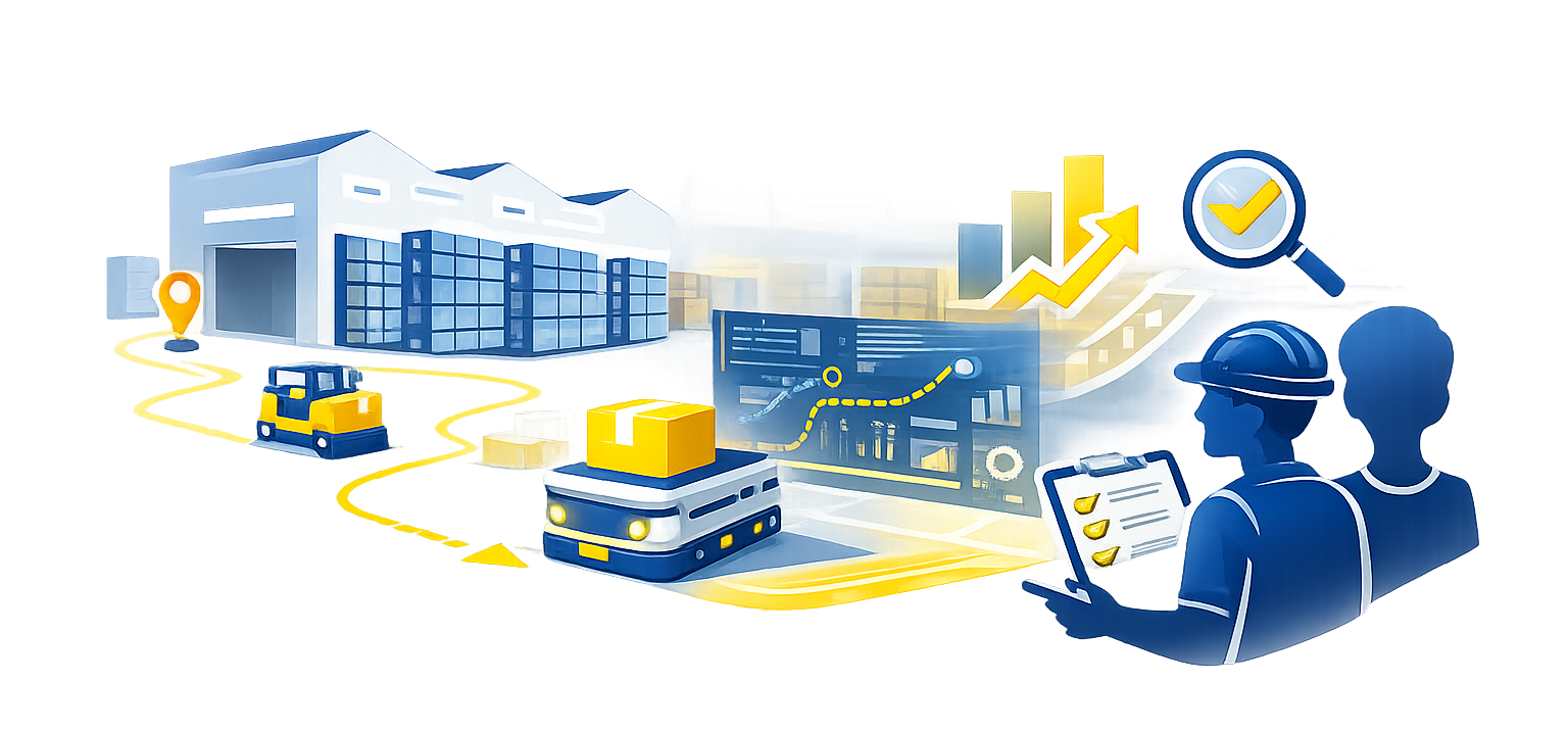 Nếu kết quả ước tính cho thấy tiềm năng khả quan, chúng tôi có thể tiến hành xác thực trực tiếp tại kho bằng thiết bị demo để kiểm chứng tuyến đường vận chuyển, mô hình tác vụ, các ràng buộc thực tế và hiệu suất dự kiến. Điều này giúp bạn đưa ra quyết định dựa trên điều kiện vận hành thực tế, thay vì chỉ dựa trên giả định.
