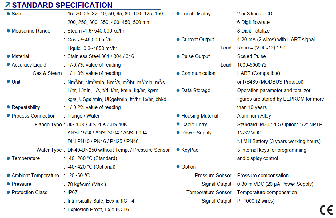 3. Thông số kỹ thuật đồng hồ Vortex đo lưu lượng